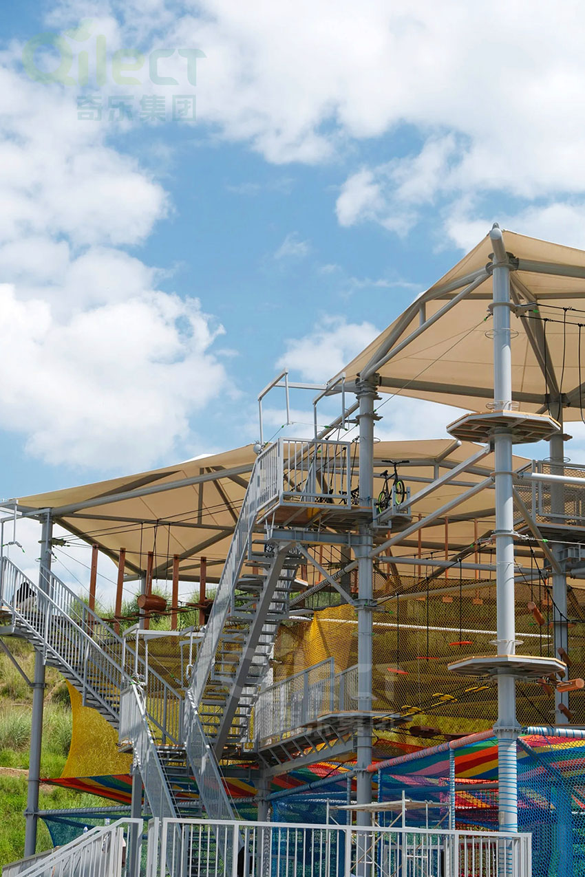 二層設計為一個繩網體驗層+16個拓展步道,輕極限體驗,挑戰難度適中,可以讓挑戰者更好的適應,先培養信心,以便完成更高一層的挑戰。